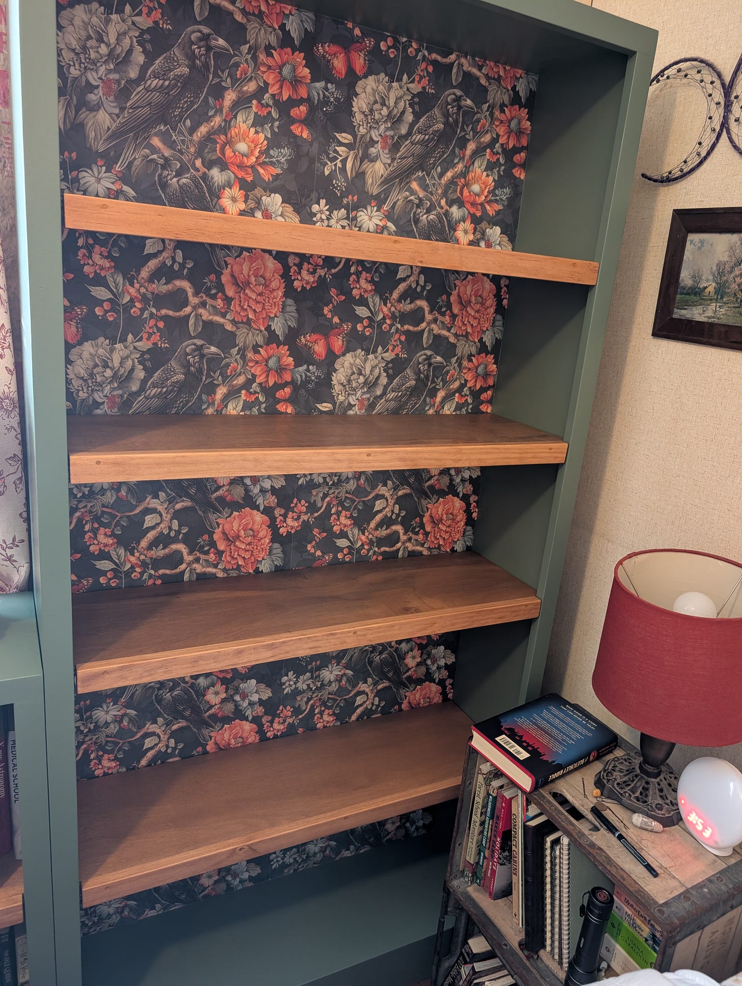 This image was a major influence in my newly complete bookshelves with this wall paper in the back and a deep, sagey green paint!